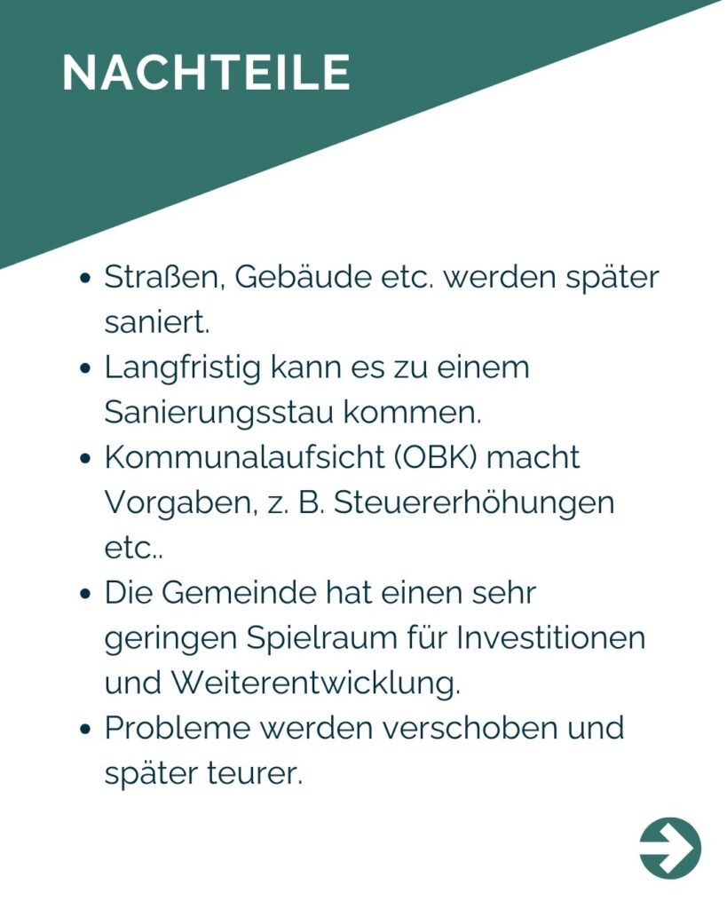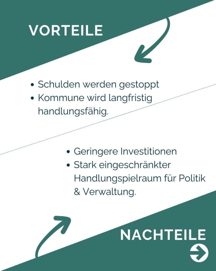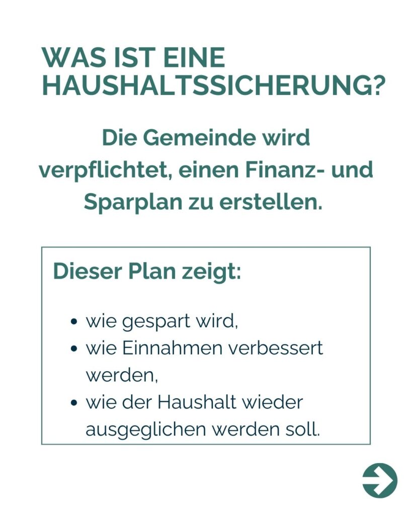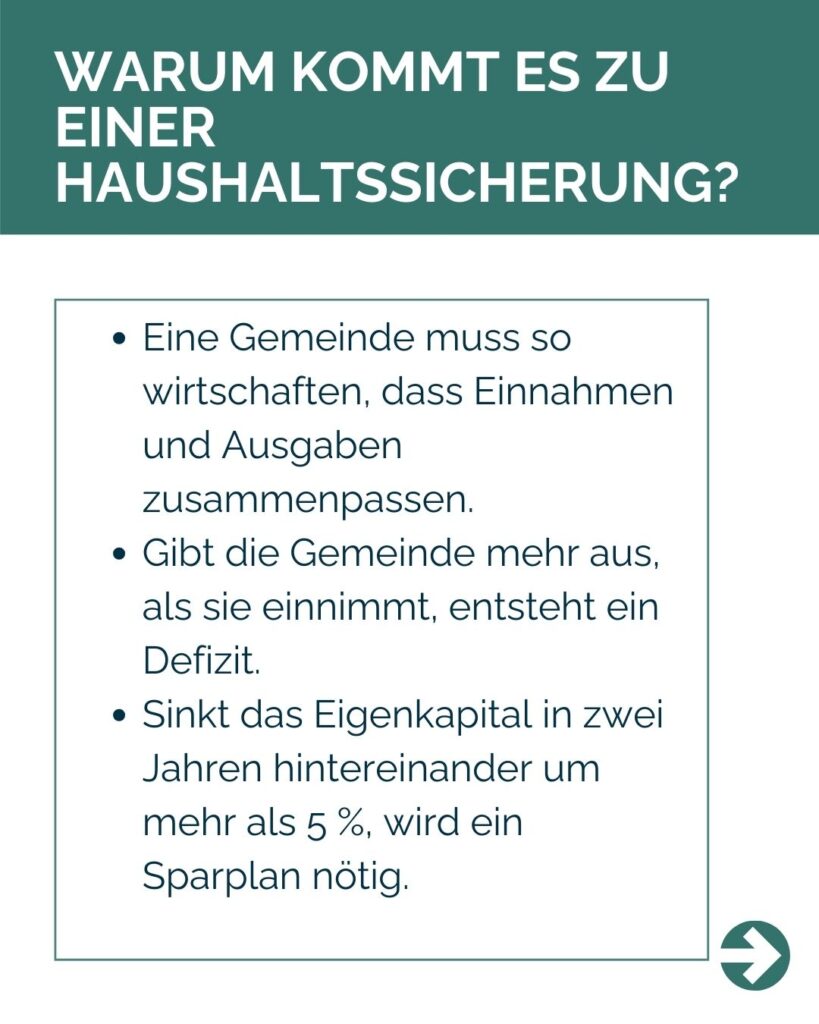 Eine Gemeinde muss so wirtschaften, dass Einnahmen und Ausgaben ausgeglichen sind. Gibt sie über längere Zeit mehr Geld aus, als sie einnimmt, entsteht ein Defizit. Wenn dieses Defizit nicht ausreichend abgebaut wird – zum Beispiel durch Sparen, höhere Einnahmen oder Steueranpassungen – kann eine Haushaltssicherung notwendig werden. Ein Haushaltssicherungskonzept muss unter anderem aufgestellt werden, wenn in zwei aufeinanderfolgenden Jahren mehr als 5 % des Eigenkapitals verbraucht werden. Der Zeitraum dafür beträgt meist mehrere Jahre – oft bis zu 10 Jahre.
