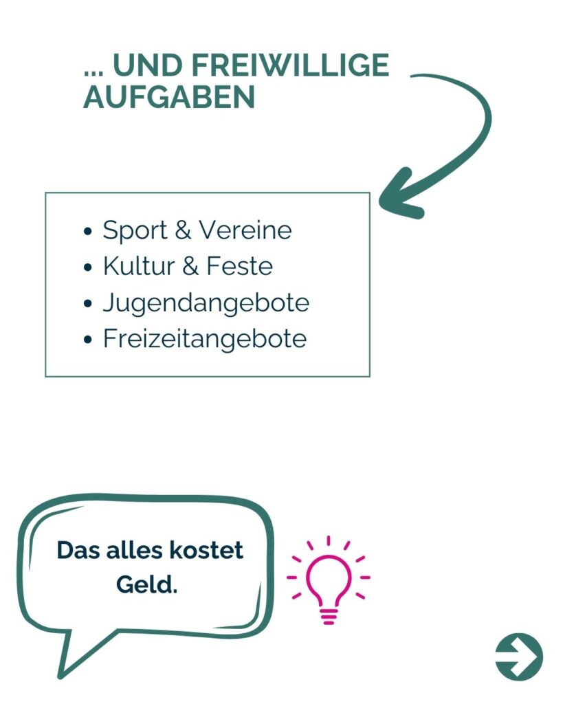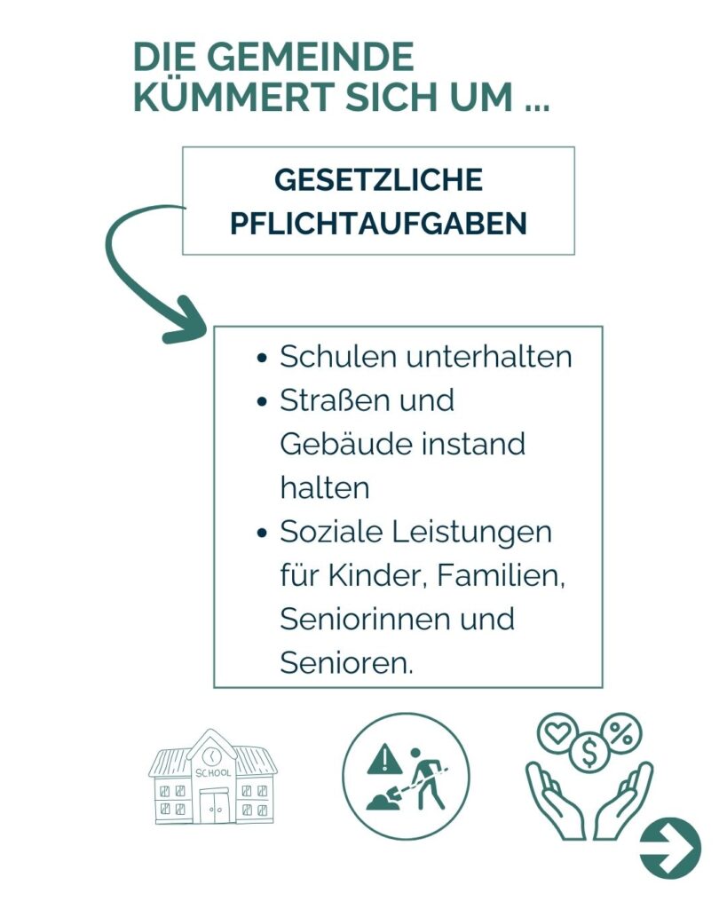 Kurz erklärt: Die Gemeinde hat viele Aufgaben – von Schulen über Straßen bis zu sozialen Angeboten. Dafür braucht sie Geld aus Steuern, Gebühren und Zuschüssen.