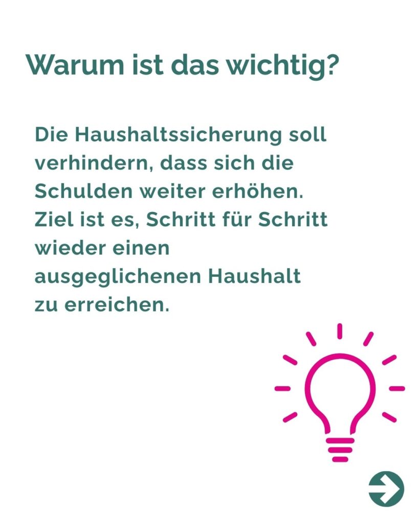 Die Haushaltssicherung soll verhindern, dass sich die Schulden weiter erhöhen. Ziel ist es, Schritt für Schritt wieder einen ausgeglichenen Haushalt zu erreichen, damit die Gemeinde langfristig handlungsfähig bleibt.